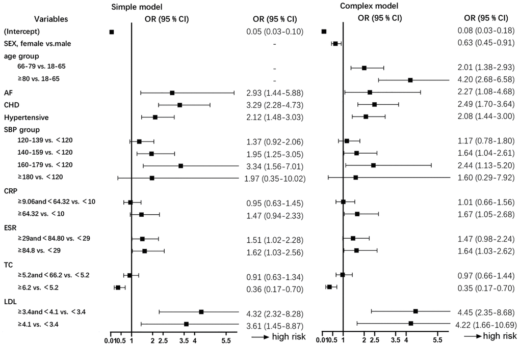 All variables in this analysis are listed in Table 2. These were carefully selected to ensure parsimony and practicality of the final model (noted in the Methods section). We finally identified the following 10 variables with the strongest association with stroke risk: sex, age, SBP, CRP, ESR, TC, LDL, and history of hypertension, diabetes, AF, and CHD. Based on the final complex model of multivariate analysis shown in Figure 1, several variables were independently associated with stroke among RA patients, such as sex (0.63 [0.45–0.91]), AF (2.27 [1.08–4.68]), CHD (2.49 [1.70–3.64]), hypertension (2.08 [1.44–3.00]), SBP stratification (for 140–159 vs.<120, 1.64 [1.04–2.61]; for 160–179 vs. <120, 2.44 [1.13–5.20]), CRP stratification (for ≥64.32 vs. <9.06, 1.67 [1.05–2.68]), ESR stratification (for ≥84.8 vs. <29, 1.64 [1.03–2.62]), TC stratification (for ≥6.2 vs.<5.2, 0.35 [0.17–0.70], LDL stratification (for 3.4–4.1 vs.<3.4, 4.45 [2.35–8.68]; for ≥4.1 vs.<3.4, 4.22 [1.66–10.69]). The final simple model of multivariate analysis is shown in Figure 1. A comprehensive analysis of vital indicators of machine learning models, shown in Figure 2 and Supplementary Table 1, reveals that the effect of the LR model on nomogram was better compared with other machine learning models. In addition, the LR algorithm effectively predicted the current data, simultaneously indicating the better efficiency of the complex model than the simple model. Finally, the complex model was used to create the nomogram by incorporating the above independent predictors (Figure 3). The nomogram revealed the score of influencing factors, the personal total cumulative score, and the predicted risk value of the individual outcome event for RA patients.