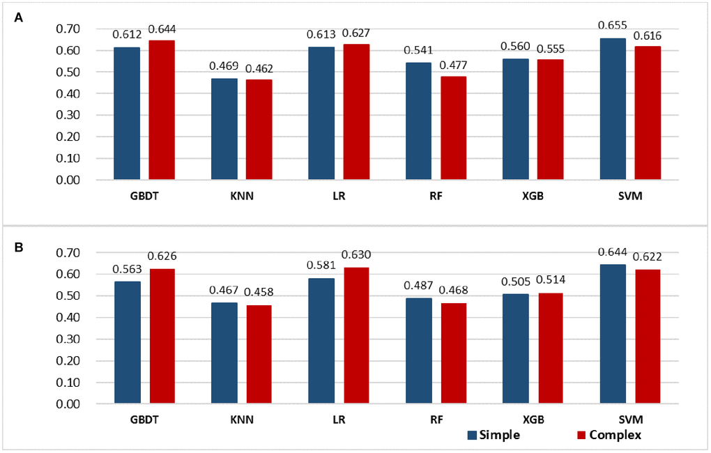 Machine learning algorithms were used based on scikit-learn, an open-source machine learning library, using Bayesian optimization to implement algorithm optimization, and cross-validation method (N-folds = 5) to complete algorithm evaluation during optimization. We used six different machine algorithms running for three 30-min sessions, including LR, Support Vector Machine (SVM), random forest (RF), XGBoost (XGB), gradient boosting decision tree (GBDT), and k-nearest neighbors (KNN), to compare algorithms and evaluate simple and complex models in primary and validation cohorts, respectively. The cohorts were compared by evaluation metrics as follows: 1) accuracy: the proportion of patients who were predicted as their actual status; 2) precision: the proportion of patients who actually had the disease and were predicted out of patients who were predicted as having the disease; 3) recall: the proportion of patients who were predicted as having disease out of all patients who actually had the disease, corresponding to sensitivity; 4) F1-score: the harmonic mean of precision and recall. F1 = 2Precision × recall/(precision + recall); and 5) balance error (ber): combining bias and variance to reflect the accuracy of the model.