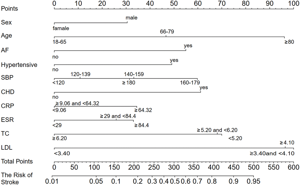 We used the EMR data from hospitalized patients in northern China to develop and validate a nomogram for predicting stroke risk in RA patients. The risk nomogram incorporated several factors, including sex, age, SBP, CRP, ESR, TC, LDL, and the history of hypertension, AF, and CHD.