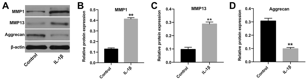 IL-1β plays a crucial role during the pathogenesis of OA [16]. Jiang et al. found that IL-1β significantly induced the apoptosis, inflammatory response and cartilage matrix destruction of chondrocytes [17]. Thus, to construct in vitro model of OA, CHON-001 cells were treated with IL-1β [18]. Western blotting was applied to detect the expression of protein biomarkers in OA [19, 20]. As indicated in Figure 1A, 1C, IL-1β induced the level of MMP-1 and MMP-13, whereas it inactivated Aggrecan in cells (Figure 1A, 1D). These data confirmed that the in vitro model of OA was successfully constructed.