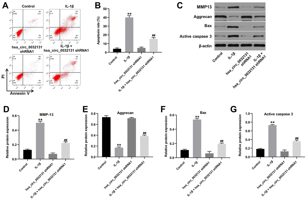 Flow cytometry data, shown in Figure 3A, 3B, revealed that IL-1β-induced CHON-001 cell apoptosis was rescued by hsa_circ_0032131 silencing. The expression of MMP-13, Bax, and active caspase 3 was upregulated by IL-1β in CHON-001 cells; this effect was partially rescued by hsa_circ_0032131 shRNA1 (Figure 3C–3F). In contrast, IL-1β-induced decrease in Aggrecan expression was partially reversed by knockdown of hsa_circ_0032131 (Figure 3C, 3G). Altogether, IL-1β-induced CHON-001 cell apoptosis was rescued by knockdown of hsa_circ_0032131.