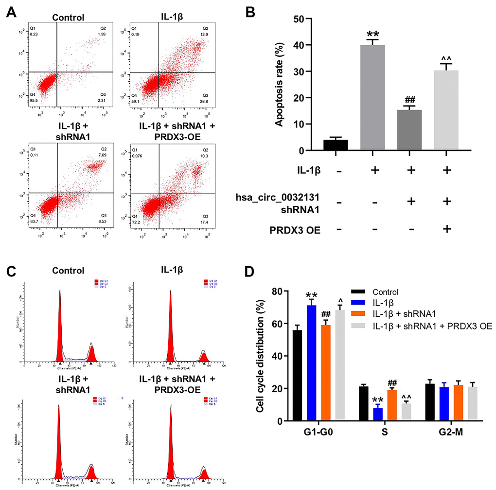 The mechanism by which hsa_circ_0032131 participated in the progression of OA was explored. As indicated by the flow cytometry data shown in Figure 6A, 6B, the anti-apoptotic effect of hsa_circ_0032131 downregulation on IL-1β-stimulated CHON-001 cells was rescued by PRDX3 overexpression. Moreover, IL-1β-induced G1 arrest of CHON-001 cells was rescued by hsa_circ_0032131 silencing, whereas this effect was partially reversed by PRDX3 overexpression (Figure 6C, 6D). In summary, the overexpression of PRDX3 rescued the impacts of hsa_circ_0032131 shRNA1 on the growth of IL-1β-stimulated cells.