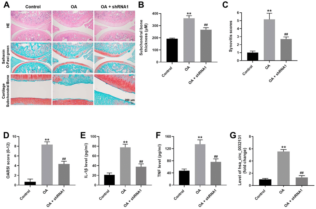 To further study the effects of hsa_circ_0032131 on OA, an in vivo model of OA was established in rats. As revealed in Figure 7A, cartilage destruction and articular chondrocyte cellularity loss in OA rats were reversed by hsa_circ_0032131 knockdown. The upregulated subchondral bone thickness was observed in OA rats, while hsa_circ_0032131 shRNA1 rescued this phenomenon (Figure 7B). Additionally, hsa_circ_0032131 silencing reduced OARSI scores in OA rats (Figure 7C, 7D). Moreover, the levels of TNF-α and IL-1β in the plasma of OA rats decreased following shRNA1-induced hsa_circ_0032131 silencing (Figure 7E, 7F). Meanwhile, the level of hsa_circ_0032131 was notably increased in OA rats, whereas this effect was reversed following hsa_circ_0032131 knockdown (Figure 7G). Altogether, the knockdown of hsa_circ_0032131 attenuated OA symptoms in vivo.