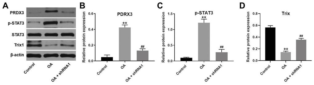 We next studied the expression of Trx1 and STAT3 in the tissues of rats by western blotting. The results indicated that protein levels of PRDX3 and p-STAT3 were upregulated in OA rats, whereas this effect was rescued following hsa_circ_0032131 knockdown (Figure 8A–8C). In contrast, Trx1 level in OA rats increased following hsa_circ_0032131 (Figure 8A, 8D). In summary, the silencing of hsa_circ_0032131 alleviated the progression of OA in vivo by inhibiting Trx1/STAT3 signaling.