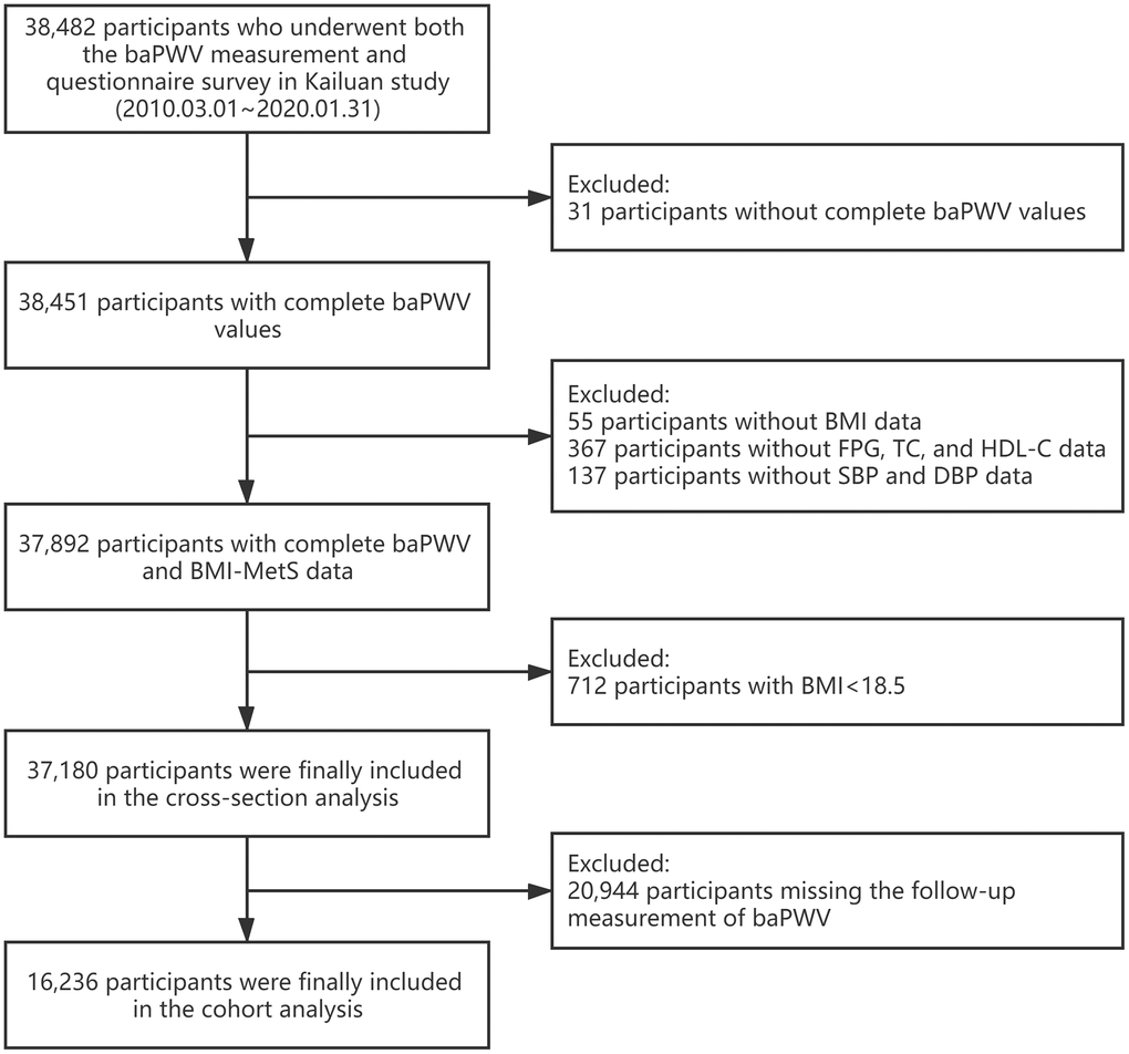 The Kailuan study is an ongoing prospective cohort study, details about the design and methods of this study have been published in detail previously [26]. From March 1, 2010, to January 31, 2020, 38,482 participants underwent both the baPWV measurement and questionnaire survey in the Kailuan cohort study. Among them, 31 participants without complete baPWV values and 559 participants without complete data regarded to BMI or MetS were excluded. Additionally, 712 individuals with a BMI below 18.5 kg/m2 were excluded. A total of 37,180 participants with at least one-time measurement of baPWV were included in the cross-sectional analysis. 16,236 participants, with repeated measurement of baPWV during a median follow-ups period of 2.8 years, were further included in the longitudinal study (Figure 1). Baseline characteristics between follow-up and lost-to-follow-up participants were shown in Supplementary Table 1.
