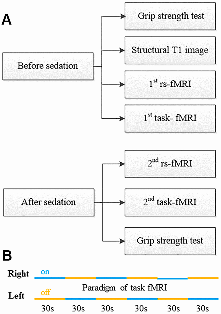 The brain task-fMRI (Figure 1B) was performed during alternating left and right four finger-to-thumb opposition movements by using T2*-weighted blood oxygen level-dependent based Echo-planar MR imaging (36 slices, repetition time/echo time = 3,000/30 ms, flip angle = 90°, field of view = 192 × 192 mm2, matrix=64 × 64, slice thickness 3.0 mm, 0.75mm intersection gap, in plane resolution: 3mm × 3mm). The task instructions were auditory-cued using a digital audiotape. All subjects were visually monitored during the experiment to ensure compliance with the protocol. After drug was infused, if the patient stopped moving because of drowsiness, he/she would be verbally reminded to continue immediately through speaker. If there were more than 2 stops in one task block, the task would be aborted and repeated.