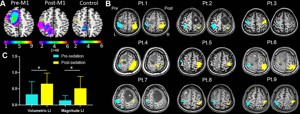 Figure 2B showed typical activation maps before and after sedation. In pre-M1 group, we found no statistical significance of either activation volume or activation magnitude between the lesional and healthy hemispheres before sedation; however, after sedation, both activation volume (P < .02) and activation magnitude (P < .02) in the lesional hemisphere was significantly lower than that in the healthy hemisphere, which were not observed in other groups. The LI-M and LI-V of M1 were strongly correlated both before (r = 0.901; P < .001) and after sedation (r = 0.908; P < .001). Both LI-V (P < .03) and LI-M (P < .02) increased significantly after sedation in pre-M1 group (Figure 2C). Surprisingly, in post-M1 group and control group, we found no significant differences for either LI-V (P = .173 versus .173) or LI-M (P = .344 versus .917) after sedation.