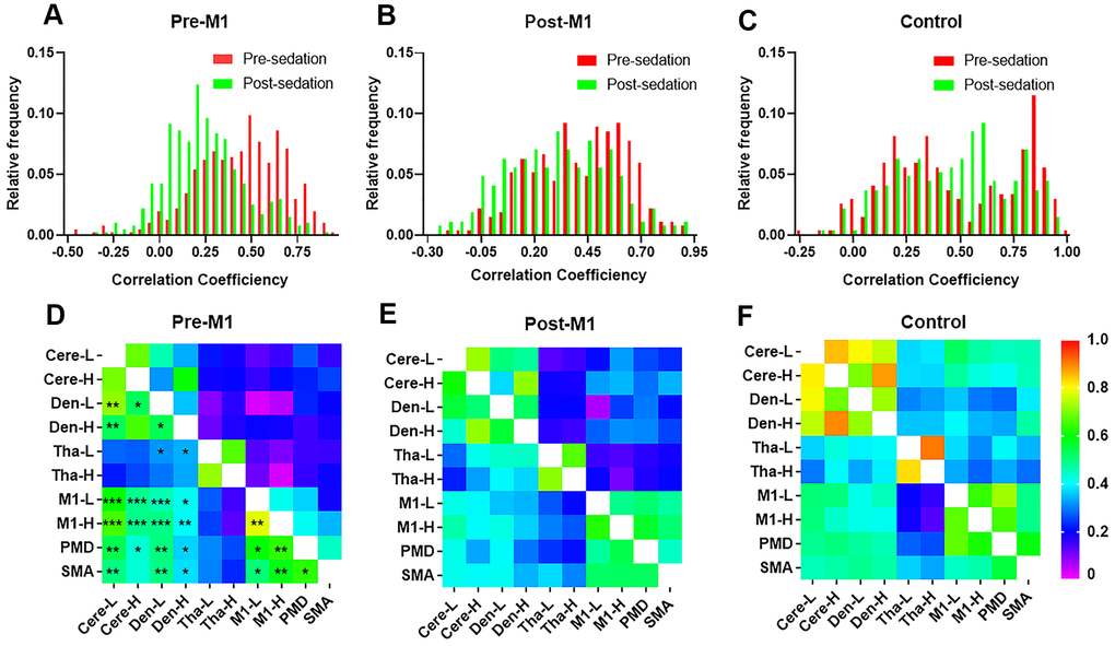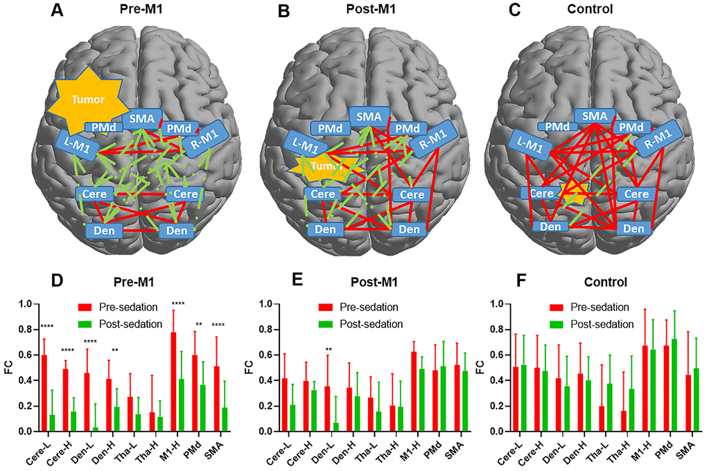 Compared with pre-sedation, 27 of 45 FCs within motor areas decreased significantly after sedation in pre-M1 group (p[FDR] < .05, Figure 3D). However, none of these FCs decreased significantly in post-M1 group and control group (Figure 3E, 3F). Compared with pre-sedation, FCs of the ipsilesional M1 with the M1-H, PMd, SMA, Cere-L, Cere-H, Den-L and Den-H were all significantly decreased after sedation in pre-M1 group (p[FDR] < .05, Figure 4D); significantly decreased FC was observed only between M1-L and Den-L in post-M1 group (p[FDR] < .05, Figure 4E); none of the FCs decreased significantly in control group (Figure 4F).