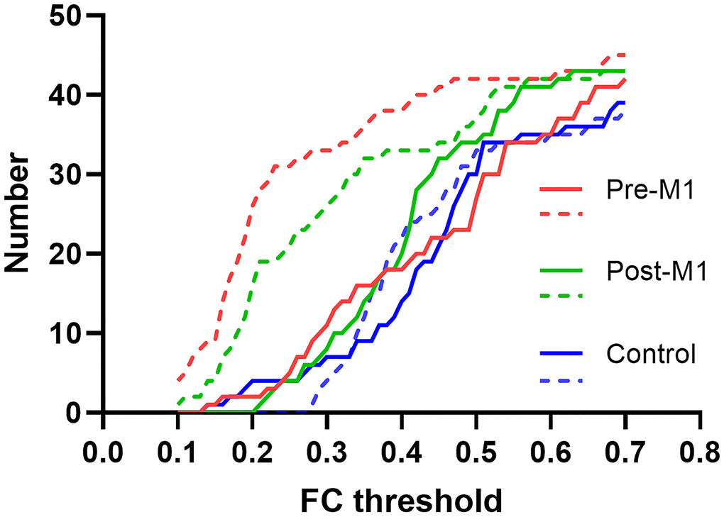 We set FC threshold at 0.3 where maximal differences were observed among the three groups (Figure 5). 34 of 45, 26 of 45 and 4 of 45 FCs were under threshold after sedation in pre-M1, post-M1, and control group respectively (Figure 4A–4C).