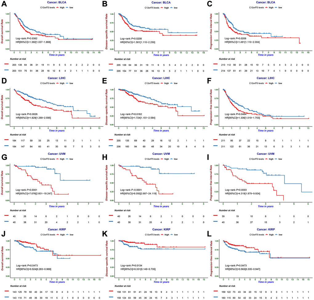 To investigate the correlation between C12orf75 expression and patient prognosis in human cancers, we applied the "survival" R package to investigate the relationship between the C12orf75 expression data of various cancers in TCGA and the patients' survival time. The results suggested that overexpression of C12orf75 was associated with a poor prognosis in bladder urothelial carcinoma (BLCA) (OS log-rank p = 0.0362, hazard ratio [HR] = 1.392 [1.037–1.868]; DSS log-rank p = 0.0208, hazard ratio [HR] = 1.581 [1.110–2.250]; PFI log-rank p = 0.0208, hazard ratio [HR] = 1.491 [1.110–2.004]) (Figure 2A–2C), hepatocellular liver carcinoma (LIHC) (OS log-rank p = 0.0026, hazard ratio [HR] = 1.829 [1.289–2.595]; DSS log-rank p = 0.0162, hazard ratio [HR] = 1.724 [1.151–2.584]; PFI log-rank p = 0.0484, hazard ratio [HR] = 1.336 [1.019–1.753]) (Figure 2D–2F), and UVM (uveal melanoma) (OS log-rank p < 0.0001, hazard ratio [HR] = 7.076 [2.601–19.247]; DSS log-rank p < 0.0001, hazard ratio [HR] = 8.050 [2.687–24.119]; PFI log-rank p < 0.0003, hazard ratio [HR] = 4.319 [1.879–9.924]) (Figure 2G–2I). By contrast, the overexpression of C12orf75 in kidney renal papillary cell carcinoma (KIRP) (OS log-rank p = 0.0473, hazard ratio [HR] = 0.524 [0.283–0.969]; DSS log-rank p = 0.0134, hazard ratio [HR] = 0.331 [0.149–0.735]; PFI log-rank p = 0.0473, hazard ratio [HR] = 0.563 [0.335–0.947]) (Figure 2J–2L) was associated with a better prognosis. These results indicated that high C12orf75 expression was correlated with shorter survival time in patients with BLCA, LIHC, and UVM, but a longer survival time in KIRP. Besides, univariate and multivariate Cox survival analysis was performed to further verify the feasibility of C12orf75 as an independent prognostic biomarker, and its expression level was still able to predict prognosis well in BLCA, KIRP, LIHC, and UVM datasets (Supplementary Tables 2–5). And, in other datasets, the hazard ratio was analyzed between the prognosis of patients with diverse cancers and the expression of C12orf75 by PrognoScan (Supplementary Figure 1).
