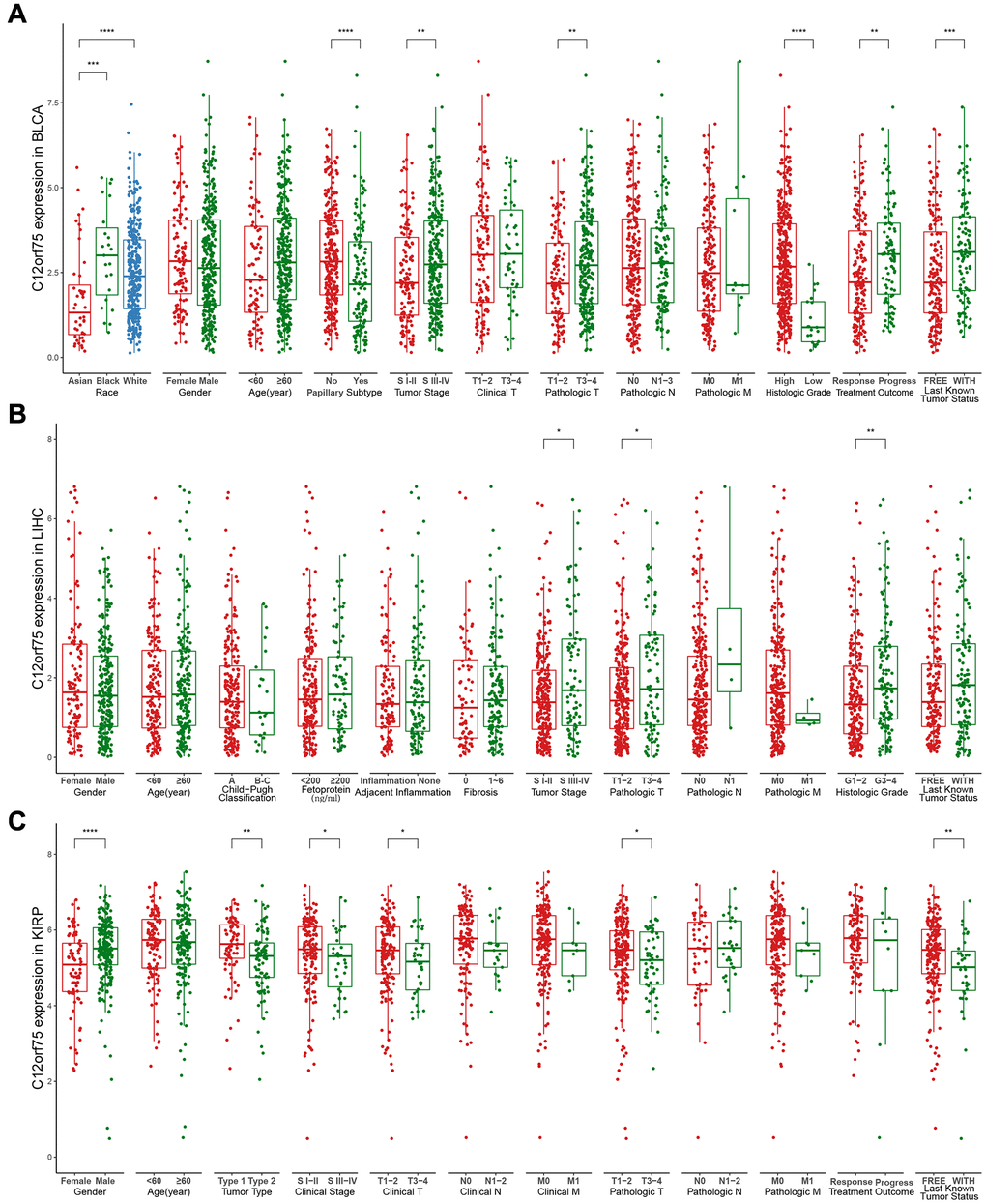 To better understand the influence of C12orf75 expression on the prognosis in cancer types that showed a distinct correlation, we analyzed various clinicopathological features in selected cancers in the TCGA database using the “ggpubr” R package. The results suggested that in BLCA, Caucasian and Black American patients had significantly higher C12orf75 expression than Asian patients (p < 0.001). The expression level of C12orf75 was significantly higher in nonpapillary than papillary carcinoma (p < 0.001). Bladder cancer of tumor stage III-IV had higher C12orf75 expression than stage I-II (p = 0.0089). According to the pathological staging, the expression of C12orf75 in stage T3-4 neoplasms was dramatically higher than in stage T1-2 (p = 0.0035). The histological tumor grade was positively correlated with the expression of C12orf75 (p < 0.001), and increased expression of C12orf75 was positively associated with tumor progression after treatment (p = 0.0025). At the last follow-up, the expression of C12orf75 was higher in patients with cancer than patients without cancer (p < 0.001) (Figure 3A). We next analyzed the association between clinicopathological features and RNA expression of C12orf75 in the TCGA-LIHC datasets. Tumors in stages III-IV had noticeably higher levels of C12orf75 than stages I-II (p = 0.034). The pathological stage was strongly related with the expression of C12orf75, with higher expression in T3-4 than T1-2 (p = 0.023). The RNA expression of C12orf75 was positively correlated with the histological tumor grade in the TCGA liver cancer dataset (p = 0.0026) (Figure 3B). In KIRP, the expression of C12orf75 in the tumors from female patients was significantly higher than in those from male patients (p < 0.001). Type 1 KIRP had an unambiguous increase of the C12orf75 expression level in the KIRP datasets (p = 0.0021). However, the level of C12orf75 transcript in KIRP tumors at an advanced clinical stage was significantly decreased compared with the early clinical stage (p = 0.043). From a clinicopathological viewpoint, the expression of C12orf75 had a negative correlation with the tumor size and tumor invasion status (p = 0.043 and p = 0.034, respectively). At the last follow-up, the expression of C12orf75 was considerably higher in patients with cancer than patients without cancer (p = 0.0067) (Figure 3C).
