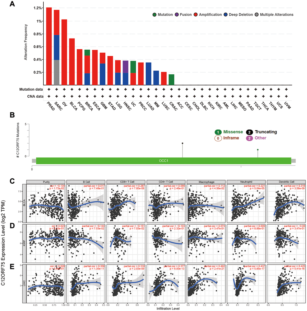 The genetic alterations of C12orf75 in distinct tumors among the TCGA cohorts were further studied. The highest alteration frequency of C12orf75 (> 1.2%) was found for patients with prostate tumors and was associated with "amplification" (Figure 4A). The "amplification" type of copy number alteration (CNA) was the major type not only in prostate cancer, but also in ovarian cancer, breast cancer, bladder cancer, pheochromocytoma and paraganglioma (PCPG), esophageal cancer, stomach cancer, KIRP, and lung squamous carcinoma (Figure 4A). The types, sites, and case numbers of the C12orf75 genetic mutations were shown in Figure 4B. Truncating mutations of C12orf75 were the primary type of genetic alteration among them.