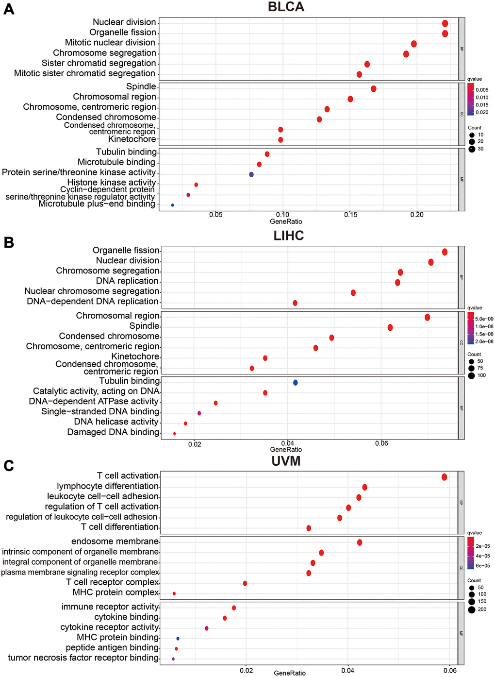 To understand the influence of variety C12orf75 expression on the biological phenotype of tumor cells, we conducted GO pathway enrichment analysis of genes. Genes associated with C12orf75 were predicted to be involved in several biological processes, cellular components, and molecular functions. In BLCA, we found that nuclear division, organelle fission, mitotic nuclear division, chromosome segregation, sister chromatid segregation, and mitotic sister chromatid segregation were enriched in the category of biological processes, spindle, chromosomal region, centromeric region (chromosome), condensed chromosome, centromeric region (condensed chromosome) and kinetochore enriched into the category of cellular components, while tubulin binding, microtubule binding, protein serine/threonine kinase activity, histone kinase activity, cyclin-dependent protein (serine/threonine kinase activity) and microtubule plus-end binding were enriched into the category of molecular functions (Figure 5A). In LIHC, we found that organelle fission, nuclear division, chromosome segregation, DNA replication, nuclear chromosome segregation, and DNA-dependent DNA replication were enriched into the category of biological processes, chromosomal region, spindle, condensed chromosome, centromeric region (chromosome), kinetochore, centromeric region (condensed chromosome) and tubulin binding were enriched in the category of cellular components, while tubulin binding, catalytic activity (acting on DNA), DNA-dependent ATPase activity, single-stranded DNA binding, DNA helicase activity and damaged DNA binding were enriched in the category of molecular functions (Figure 5B). In UVM, we found that T cell activation, lymphocyte differentiation, leukocyte cell-cell adhesion, regulation of T cell activation, regulation of leukocyte cell−cell adhesion, and regulation of leukocyte cell−cell adhesion were enriched in the category of biological processes, endosome membrane, intrinsic component of organelle membrane, integral component of organelle membrane, plasma membrane signaling receptor complex, T cell receptor complex and, MHC protein complex were enriched in the category of cellular components, while immune receptor activity, cytokine binding, cytokine receptor activity, MHC protein binding, peptide antigen binding, and tumor necrosis factor receptor binding were enriched in the category of molecular functions (Figure 5C). These enriched pathways were positively associated with the biological characteristics of each tumor.