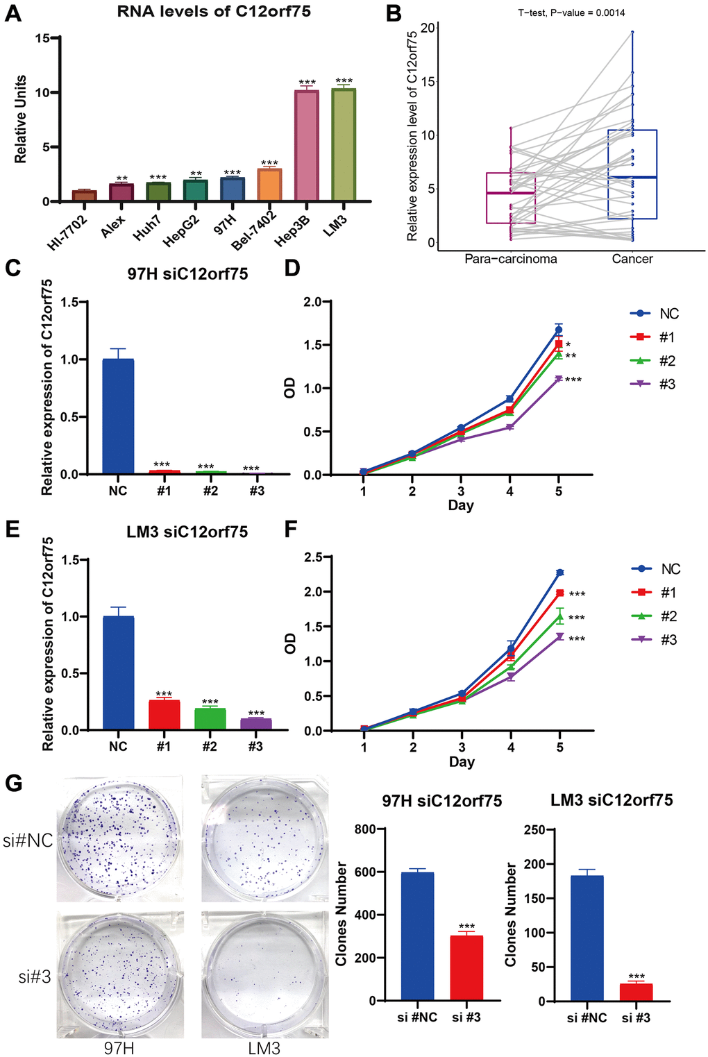 To explore the RNA expression C12orf75 in liver cancer, RT-PCR analysis was conducted in human normal hepatocyte cell line Hl-7702 and distinct liver cancer cell lines (Alex, Huh7, HepG2, 97H, Bel-7402, Hep3B, and, LM3). As shown in Figure 6A, the expression of C12orf75 was distinctly higher in the HCC cell lines than normal liver cell lines. Compared to Hl-7702 cells as the control, the fold change values of C12orf75 RNA expression in HCC cells were 1.629 (Alex, p < 0.01), 1.746 (Huh7, p < 0.001), 1.978 (HepG2, p < 0.01), 2.208 (97H, p < 0.001), 3.016 (Bel-7402, p < 0.001), 10.206 (Hep3B, p < 0.001), and 10.364 (LM3, p < 0.001). To verify the correlation between the C12orf75 and HCC tumorigenesis, the level of C12orf75 expression was quantified in paired HCC lesions and corresponding adjacent normal tissues using qRT-PCR analysis. As shown in Figure 6B, the RNA expression of C12orf75 was higher in HCC than paired adjacent normal tissues in all cases (average fold change 1.356, p = 0.0014). Thus, C12orf75 might play a cancer-promoting role in the tumorigenesis and progression of HCC.