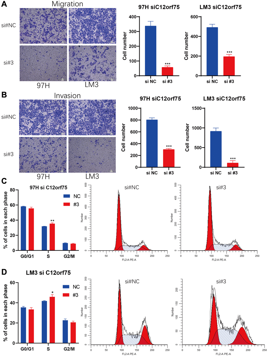 Based on the results of RNA interference, we further explored the potential impact of C12orf75 on the cell cycle. We performed flow cytometry on 97H and LM3 cells with C12orf75 knockdown to examine cell cycle changes. The results showed that the S phase population was significantly increased after C12orf75 knockdown in 97H and LM3 cells (p < 0.01 and p < 0.05, respectively). Thus, C12orf75 knockdown induced cell cycle arrest in the S phase (Figure 7C, 7D).