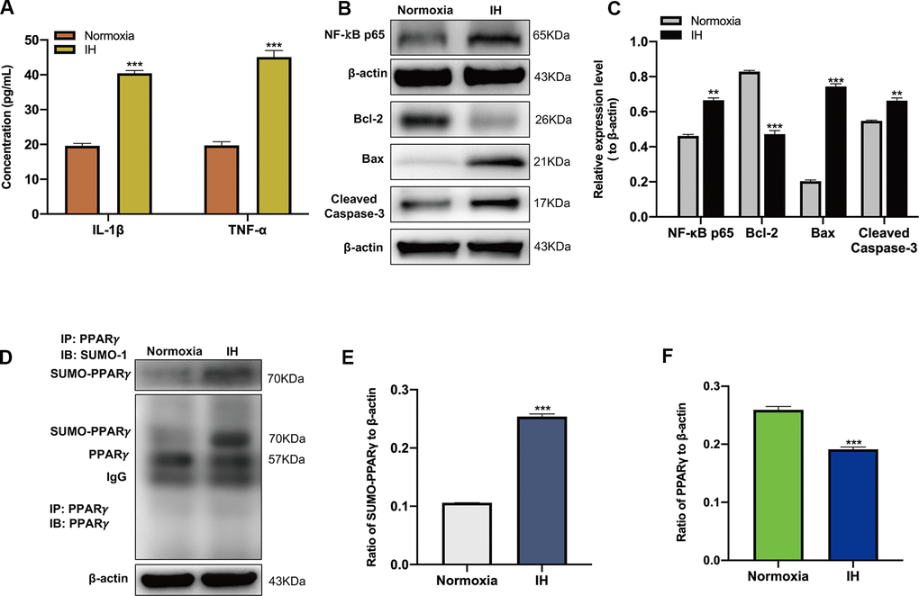 Obstructive sleep apnea (OSA) is a common sleep disorder characterized by repetitive collapse of the upper airway during sleep, which is associated with neurocognitive impairment [1]. Intermittent hypoxia (IH) induced by OSA causes neuronal damage in hippocampus, resulting in cognitive decline [2, 3], and the chronic inflammation of microglia induced by IH plays a crucial role in OSA-related cognitive dysfunction [4–6]. Nuclear factor kappa B (NF-κB) pathway is generally involved in inflammation, including pancreatitis [7], cerebral ischemia [8], and chronic obstructive pulmonary disease [9]. Evidence has shown that peroxisome proliferator-activated receptor γ (PPARγ) can inhibit the expression of inflammatory gene by directly regulating the activity of NF-κB subunits and p38 mitogen-activated protein kinase [10]. Besides, a previous study has reported that SENP1 restricts inflammatory response in adipocytes by promoting the de-SUMOylation of NEMO, inhibiting NF-κB activity and the generation of cytokines [11]. Moreover, our previous study also found that SENP1 inhibited inflammatory response in BV-2 microglial cells with IH treatment [12]. In addition, related study has been indicated that the mechanism underlying the neuroinflammation in IH impairment and the resultant cognitive decline may be associated with the activation of PPARγ [13].