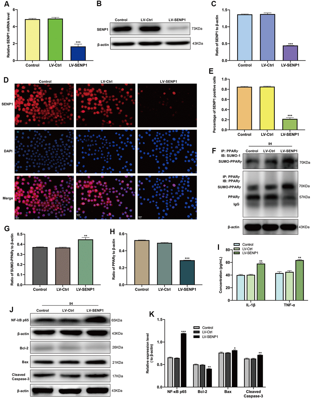 The SUMOylation of PPARγ was then estimated by CO-IP analysis, which showed that IH upregulated the SUMOylation of PPARγ and decreased the level of PPARγ in BV-2 cells (Figure 1D–1F). To identify the regulatory mechanism of SENP1 on the IH-induced inflammatory response, we downregulated the expression of SENP1 in BV-2 cells and then examined the levels of proteins associated with inflammation and apoptosis in BV-2 cells or HT-22 cells. After transfection, the expression of SENP1 was significantly downregulated, which was estimated by qRT-PCR (Figure 2A), western blot analysis (Figure 2B, 2C), and cellular immunofluorescence analysis (Figure 2D, 2E). Subsequently, we evaluated the effect of SENP1 on the SUMOylation of PPARγ using CO-IP analysis under IH condition, which showed that SENP1 depletion significantly enhanced the SUMOylation of PPARγ (Figure 2F, 2G) and further reduced the level of PPARγ (Figure 2F, 2H) in comparison with that in BV-2 cells without SENP1 knockdown. To determine the effect of SENP1 depletion on inflammatory responses and neuronal apoptosis, the expression of IL-1β, TNF-α and NF-κB p65 were detected using ELISA and western blot analysis, which showed that the expression of IL-1β, TNF-α and NF-κB p65 were significantly increased in comparison with that in BV-2 cells with SENP1 Knockdown (Figure 2I–2K), indicating that SENP1 depletion promoted inflammatory response induced by IH. The apoptosis-related proteins in HT-22 cells then were detected by western blot analysis, which showed that SENP1 depletion upregulated the expression of Bax, Cleaved caspase-3 and downregulated the expression of Bcl-2 compared to that cocultured with conditioned medium in BV-2 cells without SENP1 Knockdown (Figure 2I–2K), suggesting that the inflammatory response promoted by SENP1 depletion could enhance neuronal apoptosis under IH condition.