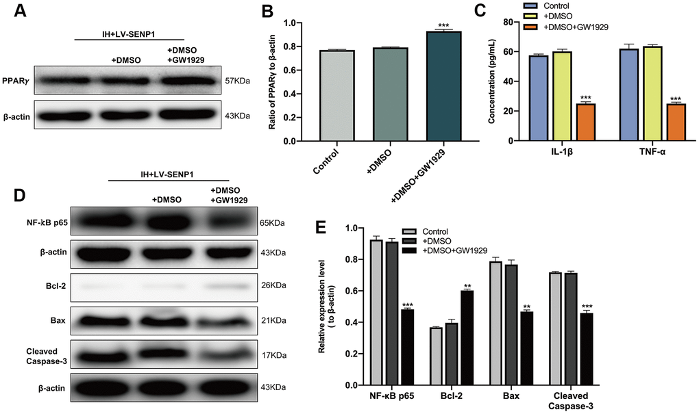 To determine the effect of PPARγ on the IH-induced inflammatory response and neuronal apoptosis, the reduction of PPARγ in SENP1 knockdown BV-2 cells was interrupted by the PPARγ agonist, GW1929. Western blot analysis (Figure 3A, 3B) showed that the expression of PPARγ was significantly upregulated than that in the dimethyl sulfoxide (DMSO) group, and no significant difference between the DMSO group and the control group. The protein expression of IL-1β, TNF-α and NF-κB p65 were then detected by ELISA and western blot analysis, which showed that the administration of GW1929 significantly inhibited the expression of IL-1β, TNF-α and NF-κB p65 (Figure 3C–3E). The apoptosis-related proteins in HT-22 cells then were detected by western blot analysis, which showed that the upregulation of PPARγ decreased the protein expression of Bax, Cleaved caspase-3 and increased the expression of Bcl-2 compared with the DMSO group, and there was no significant difference between the DMSO group and group (Figure 3D, 3E), suggesting that the inflammatory responses and neuronal apoptosis promoted by SENP1 depletion under IH condition could abolished by the application of GW1929.Together, these results suggested that SENP1 depletion promoted the IH-induced inflammatory response and neuronal apoptosis by accelerating the SUMOylation of PPARγ in BV-2 cells.