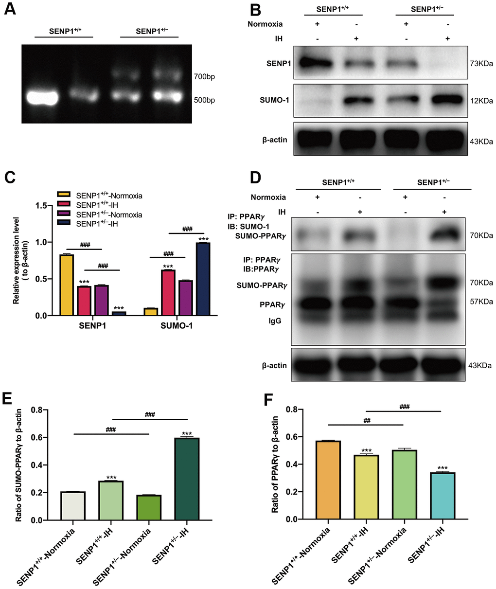 To investigate the effect of SENP1 depletion on the SUMOylation of PPARγ in vivo, we knocked down the gene expression of SENP1 in mice using gene-editing technology. The genotype of mice and the knockdown efficiency of SENP1 were identified using DNA agarose electrophoresis and western blot analysis, respectively. DNA agarose electrophoresis results showed that the genotype of wild-type mice was that of a homozygote, and the SENP1 knockdown mice’s genotype was that of a mutant heterozygote (Figure 4A). The knockdown efficiency results showed that the expression of SENP1 was significantly decreased in SENP1 knockdown mice compared with that in wild-type mice (Figure 4B, 4C). In addition, we also observed that the expression of SENP1 was decreased in both IH groups compared with that in normoxia groups, and it was lower in the SENP1 knockdown group than that in the wild-type group under IH condition. In contrast, the expression of SUMO-1 in hippocampus of mice was significantly increased after SENP1 knockdown under IH and normoxic conditions, and IH further increased this enhancement (Figure 4B, 4C). These results suggested that SENP1 knockdown enhanced the SUMOylation in vivo. After IH treatment, the effect of SENP1 depletion on the SUMOylation of PPARγ in hippocampus of mice with or without SENP1 knockdown was evaluated using CO-IP, which showed that IH promoted the SUMOylation of PPARγ, and significantly decreased the level of PPARγ. Moreover, SENP1 depletion significantly promoted these alterations (Figure 4D–4F), suggesting that SENP1 depletion downregulated the level of PPARγ in hippocampus of mice by accelerating the IH-induced SUMOylation of PPARγ.