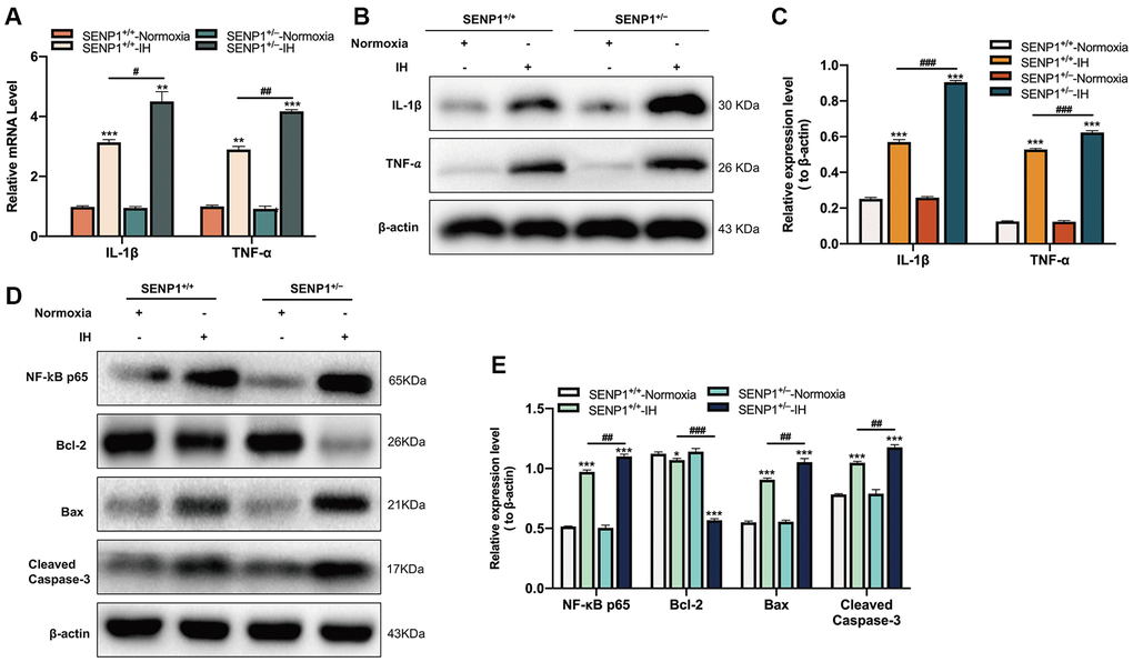 Subsequently, the expression of IL-1β and TNF-α in hippocampus of mice were evaluated by qRT-PCR and western blot analysis. qRT-PCR results showed that IH significantly upregulated the expression of IL-1β and TNF-α, and the upregulation in SENP1 knockdown mice was more obvious than that in wild-type mice (Figure 5A). Western blot analysis results showed a similar trend: IH increased the inflammatory response, and SENP1 depletion further promoted the enhancement induced by IH (Figure 5B, 5C). The NF-κB p65 and apoptosis-related proteins in hippocampus of mice were detected by western blot analysis, which showed that IH significantly increased the expression of NF-κB p65, Bax, Cleaved caspase-3 and decreased the expression of Bcl-2 compared to that with normoxic treatment, and the enhancement in SENP1 knockdown mice was more obvious than that in wild-type mice (Figure 5D, 5E), suggesting that SENP1 depletion promoted the inflammatory response and neuronal apoptosis induced by IH in hippocampus of mice.