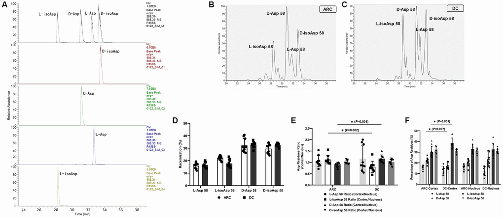 Using half of each lens tissue (without separating the cortex and nucleus) in each group, we calculated the average racemization rates for each Asp 58 isomer (Figure 1D). The average D/L-isomers ratio in the DC group was 1.98 ± 0.30, and the ratio in the ARC group was 1.67 ± 0.35 (P = 0.048). We did not find any significant differences in αA-crystallin of lenses between the two groups concerning the levels of the four different Asp 58 isomers (all P > 0.05).