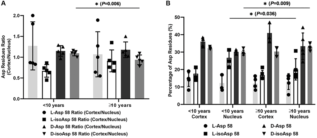 Moreover, we analyzed the correlation between the duration of diabetes and the ratio of different Asp 58 isomers to evaluate the possible influence of longer period of hyperglycemia status on racemization (Figure 2A and 2B). When we divided the patients with DC into two subgroups according to the duration of diabetes (less than ten years and more than ten years), we found that the cortex/nucleus ratio of D-isoAsp 58 was significantly lower in the subgroup with a duration of disease less than ten years (P = 0.006, Figure 2A), which originated mainly from the increased percentage of D-isoAsp 58 in the nucleus of DC (from 29.57% ± 1.52% to 33.08% ± 2.02%) with the increased duration of hyperglycemia (Figure 2B). We did not find a significant difference in the comparisons of the cortex/nucleus ratio of other Asp isomers between the two subgroups (L-Asp 58, P = 0.542; L-isoAsp, P = 0.214; D-Asp 58, P = 0.417). According to the percentage of four Asp 58 isomers, when the hyperglycemia status persisted for a longer time, the elevated conversion of L-isomers to D-isoAsp 58 in lens nucleus of DC patients was the primary reason for this difference in the racemization pattern of αA-crystallin.