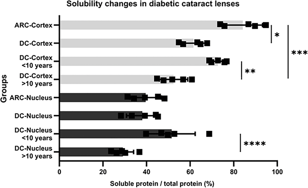 We measured the total amount of soluble and insoluble protein in a subset of the treated human lenses by BCA assays, as shown in Figure 3. In the cortex of DC lenses over ten years, the average ratio of soluble protein-to-total protein significantly decreased to 52.80%, compared with those in the cortex of ARC lenses (84.76%) and of DC lenses less than ten years (71.78%) (P < 0.001, ARC cortex vs. DC cortex > 10 years; P = 0.013, DC cortex < 10 years vs. DC cortex > 10 years). Moreover, in the nucleus of DC lenses over ten years, the ratio of soluble protein-to-total protein significantly decreased to 28.74%, compared with those in the nucleus of DC lenses less than ten years (49.74%) (P = 0.007). We did not observe a significant difference in the soluble and total protein ratio between the DC lenses less than ten years and the nucleus of the ARC lenses.