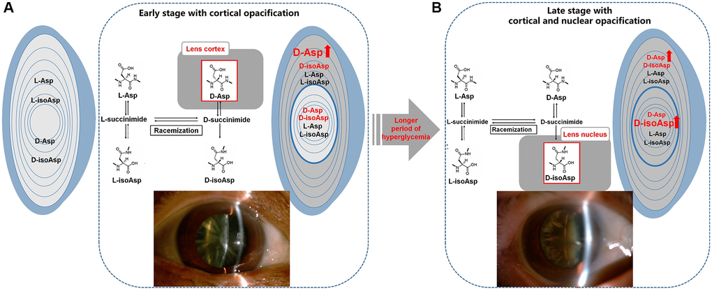 Gradual alterations in racemization patterns may also influence the DC phenotypes over the protracted duration of diabetes. The patients who were diagnosed with diabetes for more than ten years showed increased accumulation of D-isoAsp 58 in the lens nucleus compared with those who were diagnosed for less than ten years. Several seemingly independent biochemical pathways overactivated during persistent hyperglycemia in diabetes may have originated from one common abnormality caused by intracellular excess glucose flux (i.e., mitochondrial overproduction of reactive oxygen species, ROS) [29, 30]. Thus, the PTMs of the lens proteins may progress much more rapidly in DC than in ARC because of the persistent damage from ROS. These PTMs, including racemization, have the potential to disrupt the structural and functional properties of crystallins and to contribute to the formation of lens opacification [31]. On the basis of original cortical opacification, the gradually overloaded accumulation of D-isoAsp 58 in the nucleus may play a potential role in the late stage of DC with cortical and nuclear opacification (Figure 4B).