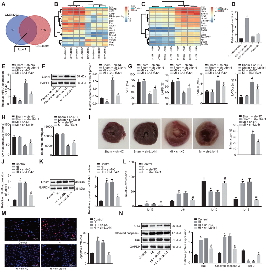 C57BL/6 mice (Beijing Vitar Experimental Animal Technology Co., Ltd., Beijing, China), weighing between 25 g to 37 g and aged 8-12 weeks were obtained to establish murine models according to a previous study [5]. Through left-anterior descending coronary artery (LAD) ligation, mouse models of MI were established and then anesthetized by 50 mg/kg pentobarbital sodium. Sham-treated mice did not receive the ligation of the LAD. At 7 days prior to the MI operation, the mice were intramyocardially injected with adenovirus (Ad, 1 × 108 PFU per mouse). Sham-operated mice were injected with sh-NC and sh-Ltb4r1 or received no treatment. MI mice were injected with sh-NC, sh-Ltb4r1, AgoNC, AgomiR-22-3p, sh-NEAT1, sh-NEAT1 + AntagoNC, sh-NEAT1 + AntagomiR-22-3p, AntagomiR-22-3p + sh-NC, and AntagomiR-22-3p + sh-Ltb4r1 or received no treatment. Twenty-four hours after the MI operation, infarct boundary zone (n = 9) was harvested for the RT-qPCR and Western blot analyses. Infarct size of another 6 mice in each group was measured using TTC staining 3 days following the MI operation.