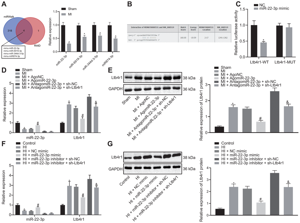 To further study the upstream regulatory mechanism of Ltb4r1 gene, miRWalk and RAID v2.0 were employed to predict the miRNA binding to Ltb4r1. It was established that four miRNAs bind to Ltb4r1 through online website. The expression of the four candidate miRNAs in MI model was detected using RT-qPCR analysis, which revealed that miR-22-3p expression exhibited most significant difference compared to that of the control group (Figure 2A, 2B). Out of the 4 candidate miRNAs, only miR-22-3p has been previously reported to protect endothelial cell damage of coronary heart disease [13]. Therefore, miR-22-3p was selected for further research. Additionally, the luciferase assay confirmed that the luciferase activity of PGLO-Ltb4r1 WT was inhibited by miR-22-3p (p < 0.05), whereas no difference was found in PGLO-Ltb4r1 MUT (p > 0.05) (Figure 2C). Determination from RT-qPCR and Western blot analyses exhibited that the miR-22-3p expression was decreased in MI mice and hypoxia-induced MI cardiomyocytes, while subsequent treatment with AgomiR-22-3p or miR-22-3p mimic increased the miR-22-3p expression (Figure 2D–2G). However, treatment with sh-Ltb4r1 did not show any significant change in the miR-22-3p expression in both MI mice and MI cardiomyocytes under hypoxia (p > 0.05). These findings demonstrated Ltb4r1 as the downstream target of miR-22-3p.