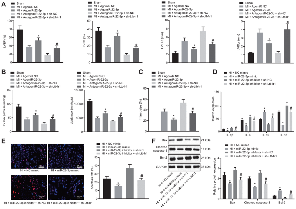 To investigate whether mir-22-3p could affect the MI following CHD by inhibiting Ltb4r1, echocardiographic and hemodynamic analysis were performed to detect cardiac function following various treatments. The data and images indicated a reduction in LVIDD, LVIDs, LVEF, LVFS, LVEDP, and +dP/dt in MI mice which were injected with AgomiR-22-3p, and an improvement in cardiac function in MI mice injected with AntagomiR-22-3p and sh-Ltb4r1 (Figure 3A, 3B). Furthermore, the TTC staining (Figure 3C) revealed that infarct size reduced in MI mice injected with AgomiR-22-3p and MI mice injected with AntagomiR-22-3p and sh-Ltb4r1.