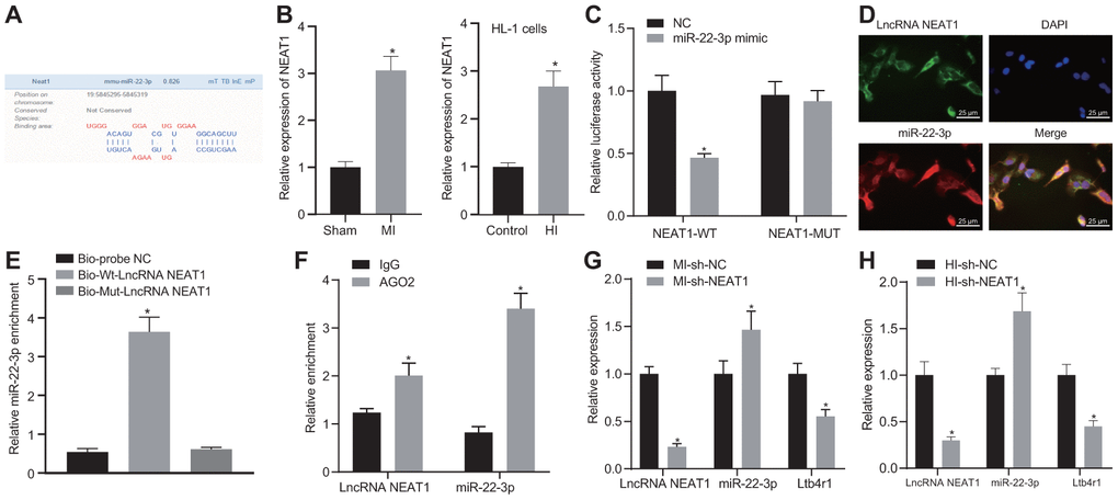The Lncbase v.2 website indicated a potential binding site between NEAT1 and miR-22-3p (Figure 4A). It was also suggested that NEAT1 might affect the myocardial injury of mice with CHD by adsorbing miR-22-3p to regulate Ltb4r1 expression. RT-qPCR results found that the expression of NEAT1 in the myocardial tissue of MI mice was higher than that in the sham-operated mice, and the expression of NEAT1 in cardiomyocytes was consistent with the expression trend in tissues (Figure 4B). The luciferase assay demonstrated that luciferase activity of PGLO-NEAT1 wide-type (WT) 3'UTR was inhibited by miR-22-3p (p < 0.05), whereas no significant difference was found in its activity in the PGLO-NEAT1 mutant (MUT) 3'UTR (p > 0.05) (Figure 4C). The fluorescence in situ hybridization (FISH) established that NEAT1 and miR-22-3p were co-localized in cytoplasm (Figure 4D). Furthermore, the RNA-pull down analysis (Figure 4E) revealed no significant difference in Bio-MUT-NEAT1 (p > 0.05) but an enrichment of miR-22-3p in Bio-WT-NEAT1 (p < 0.05). Additionally, the RIP assay (Figure 4F) demonstrated the increased binding between NEAT1 and AGO2. Moreover, following the injection of sh-NEAT1 in MI mice, miR-22-3p expression and Ltb4r1 were both found to be elevated (Figure 4G). Similar alterations were observed in hypoxia-induced MI cardiomyocytes following the treatment with sh-NEAT1 (Figure 4H). In conclusion, NEAT1 was found to inhibit Ltb4r1 expression by sponging miR-22-3p.