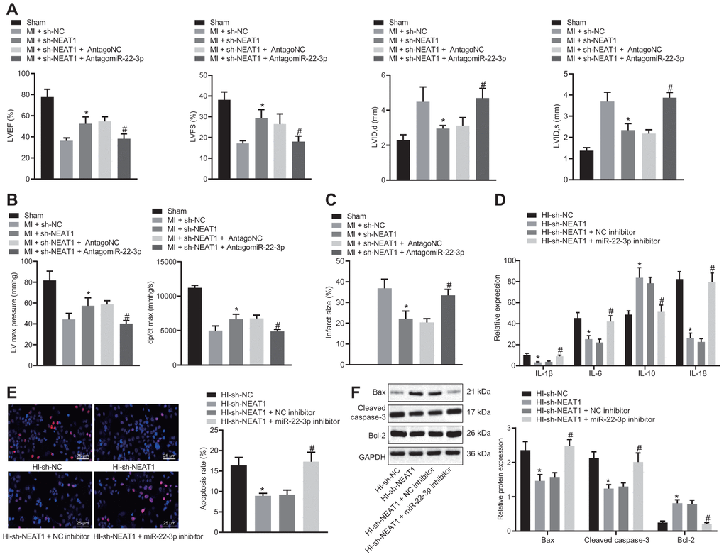 In hypoxia-induced MI cardiomyocytes, the levels of IL-1β, IL-6, and IL-18 were revealed to be decreased following the treatment with sh-NEAT1 (Figure 5D), whereas they were elevated following treatment with exogenous miR-22-3p inhibitor and sh-NEAT1. Additionally, the TUNEL staining (Figure 5E) revealed that apoptosis was inhibited in hypoxia-induced MI cardiomyocytes treated with sh-NEAT1, but it was restored following exogenous miR-22-3p inhibitor and sh-NEAT1 treatment. Moreover, sh-NEAT1 treatment (Figure 5F) decreased Cleaved caspase-3 and Bax levels, and increased Bcl-2 levels in MI cardiomyocytes, which was reversed by the treatment of exogenous miR-22-3p inhibitor. Together, NEAT1 upregulated Ltb4rl which in turn aggravated the myocardial injury in mice with CHD-related MI by sponging miR-22-3p.