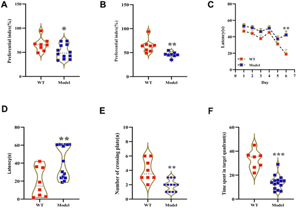 We analyzed behavioral performance of wild-type (WT) mice and those treated with 150 mg D-gal per Kg body weight for 2 months (model or Mod) using novel object recognition and Morris water maze (MWM) tests. The preferential index values in the novel object recognition test were significantly reduced in the Mod group mice compared to the WT group mice (Figure 1A, 1B). MWM test results showed that the escape latency time after sixth day was significantly increased in the Mod group compared to the WT group (Figure 1C, 1D). Moreover, target platform crossings and swimming times within the target quadrant were significantly reduced in the Mod group compared to the WT group (Figure 1E, 1F). These results demonstrated significant decline in the learning and memory abilities of the D-gal-induced aging model mice.