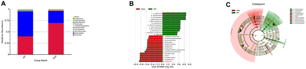 We then analyzed the differences in the abundance and composition of the gut microbial phyla, genera and species in the fecal samples of the Mod and WT groups of mice using 16S ribosomal RNA (rRNA) sequencing data from fecal samples. The predominant intestinal flora in the WT and Mod group mice were Firmicutes and Bacteroides. However, the abundance of Bacteroides was significantly reduced and the abundance of Firmicutes was significantly increased in the Mod group compared to the WT group (Figure 2A). Next, we performed linear discriminant analysis (LDA) to determine LDA effect size (LEfSe) scores followed by Kruskal-Wallis and Wilcoxon tests to evaluate the relative abundance of different taxa in the WT and Mod group mice. The LDA results are shown in Figure 2B. Furthermore, we constructed cladograms showing differential enrichment of various genera and species belonging to the Bacteriodes and Firmicutes phyla in the WT and model groups (Figure 2C). Overall, our results demonstrated impaired cognitive ability and gut microbial dysbiosis in the D-galactose-induced aging model mice.