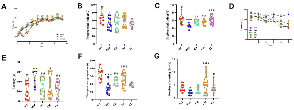 The spatial learning and memory of these mice were evaluated by Morris water maze test, and the results showed that the escape latency times of the CDPS group of mice were comparable to the WT group of mice and significantly shorter than the Mod group mice (Figure 3D). Furthermore, escape latency times were significantly lower on the sixth day post-CDPS administration compared to the model group (Figure 3E). The swimming time within the target quadrant was significantly higher in the CH and CM groups compared to the model group. The CL group is higher than the model group but no statistical significance (Figure 3F). Moreover, the number of platform crossings was significantly higher in the CM and CL groups compared to the model group. However, the CH group is higher than the model group and no statistical significance (Figure 3G). These results demonstrated that CDPS treatment improved spatial learning and memory in the D-gal-induced aging model mice.