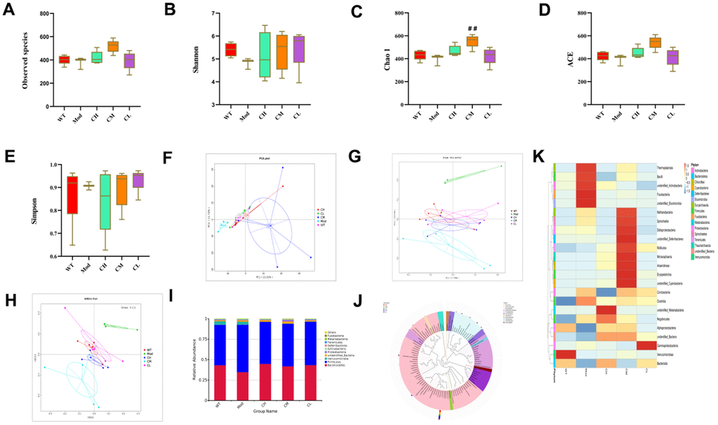 First, we calculated alpha diversity indices to evaluate the overall fecal microbiota richness and structural difference among these groups. We analyzed alpha diversity (α-diversity) indexes such as observed species, Shannon, Chao 1, ACE, and Simpson index values to determine changes in the composition of various bacterial species in the feces samples of different murine groups. The α-diversity (observed species, Shannon, Chao 1, ACE and Simpson indexes) indexes were higher in the WT and CDPS groups of mice compared to the model group, but statistical significance was only observed for the Chao 1 index values between the CM group and Mod group. It indicated that administration with CDPS increases the microbiome richness (Figure 4A–4E). Next, we analyzed β-diversity indexes to identify differences in the gut microbial species between the WT, model, and CDPS groups of mice using Non-metric Multidimensional Scaling (NMDS), Principal Coordinates Analysis (PCoA), and Principal Component Analysis (PCA). PCA showed variations in the gut microbial composition of the model group mice during the aging process, including dimension reduction and maintenance of patterns and trends (Figure 4F). The differences in the fecal microbiota between the WT, model, and CDPS groups were identified based on PCoA of the unweighted UniFrac distances for the 16S rRNA genes (Figure 4G). Clustering analysis showed significant differences in NMDS between the model group and the WT and CDPS groups (Figure 4H).