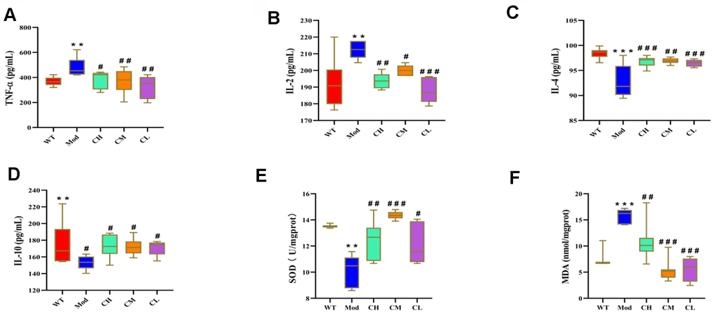 We next analyzed the effects of CDPS on inflammation by analyzing the serum levels of pro-inflammatory cytokines (IL-2 and TNF-α), and anti-inflammatory cytokines (IL-4 and IL-10) in different groups of mice. The serum levels of IL-2 and TNF-α were significantly lower and the serum levels of IL-4 and IL-10 were significantly higher in the CH, CM and CL group compared to the model group. It shown that CDPS has anti-inflammatory effects (Figure 5A–5D).
