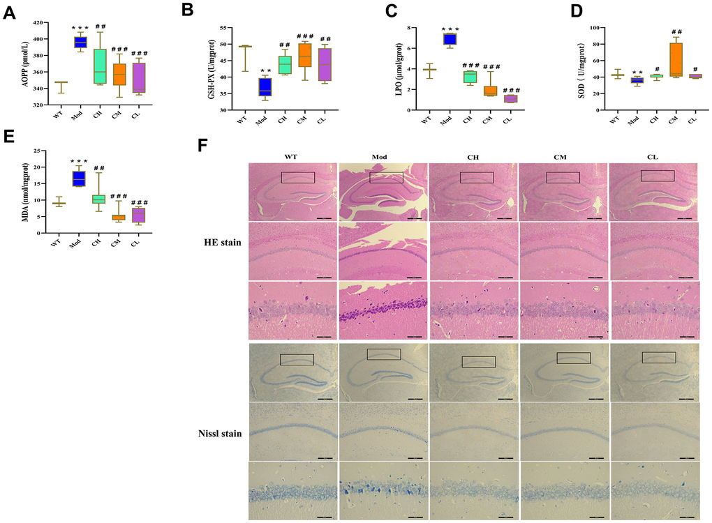Furthermore, we assessed the oxidative stress levels in the brain tissues by analyzing the levels of advanced oxidized protein product (AOPP), direct lipid peroxidation (LPO), and MDA as well as activities of antioxidant enzymes such as glutathione peroxidase (GSH-Px) and superoxide dismutase (SOD) in the brain tissue homogenates. The brains of Mod group mice showed significantly reduced activities of SOD and GSH-PX and significantly increased levels of AOPP, LPO and MDA compared to the WT group, but these effects were reversed in the CH, CM and CL group (Figure 6A–6E).