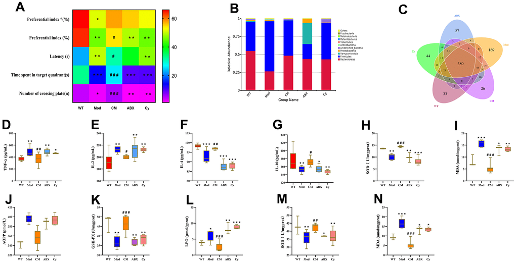 We then used the immunosuppressive drug, cyclophosphamide [24] to determine the role of inflammation in the beneficial effects of CDPS. Cyclophosphamide-treated CDPS mice (Cy group) showed impaired learning and memory ability, alterations in the gut microbiota composition, and aberrant levels of pro- and anti-inflammatory cytokines in the brain and serum compared to the wild-type and CDPS group mice. However, there is no significance comparing with model and ABX group. (Figure 7A–7N). These data demonstrate that alterations in the composition of the gut microbiota increase peripheral inflammation in the D-gal-induced aging model mice.