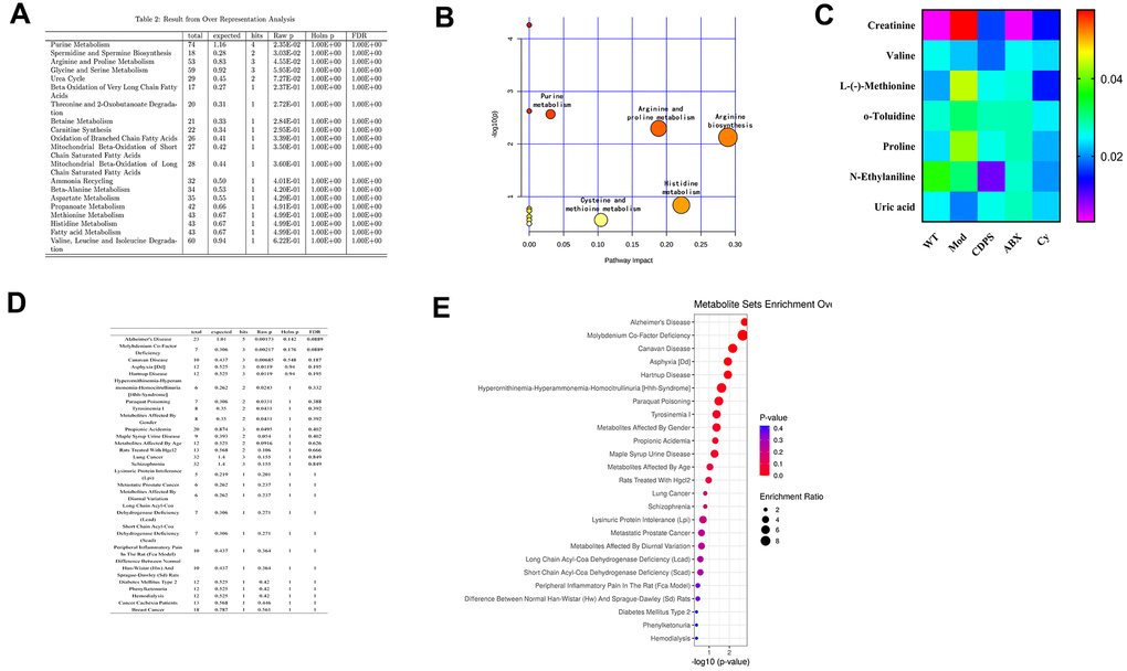 We then analyzed if changes in amino acid metabolism were related to alterations in the composition of the gut microbiota. We observed that 7 different metabolites of WT, Mod and CDPS groups (creatinine, valine, L-(-)-Methionine, o-Toluidine, N-Ethylaniline, uric acid, and proline) were significantly decreased in the ABX, Cy, and Mod groups compared to the WT and CDPS groups. Moreover, there is no significance between ABX and Cy group (Figure 8C). Finally, in order to explore there is a correlation between differential metabolism and other aging-related diseases. We analyzed the correlation between these seven differentially expressed metabolites and human diseases using the MetaboAnalyst database and found that these metabolites were associated with Alzheimer’s disease (p=0.00173; Figure 8D, 8E). Overall, these data suggested that CDPS protects against D-gal-induced aging by regulating amino acid metabolism.