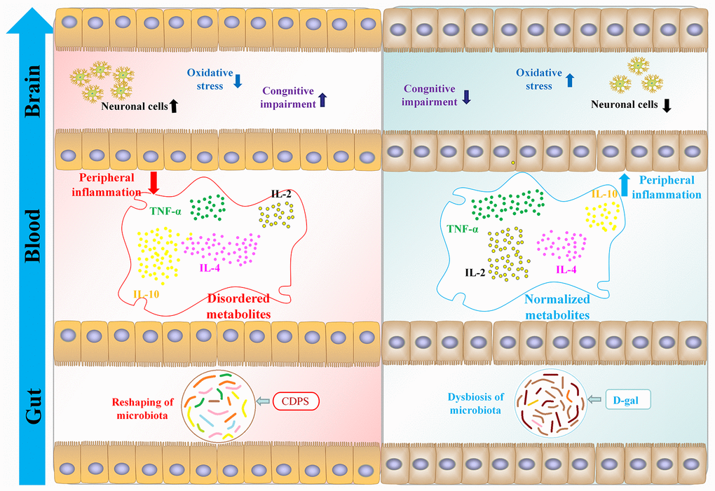 Progressive decline in cognitive function is a characteristic feature of aging. Previous studies showed that CDPS treatment significantly improved learning and memory in the aging model mice [30–33]. In this study, we demonstrated that CDPS treatment improved cognitive function by inhibiting peripheral inflammation and oxidative stress through restoration of gut microbial homeostasis in the D-gal-induced aging model mice (Figure 9). Sprague-Dawley rats fed with Cistanche polysaccharides showed increased growth of beneficial gut bacteria and enhanced gut microbial diversity [34]. CDA-0.05, a Cistanche neutral polysaccharide, improved the growth of probiotic Lactobacilli [22]. These data suggested that Cistanche polysaccharides improved homeostasis of gut bacteria.