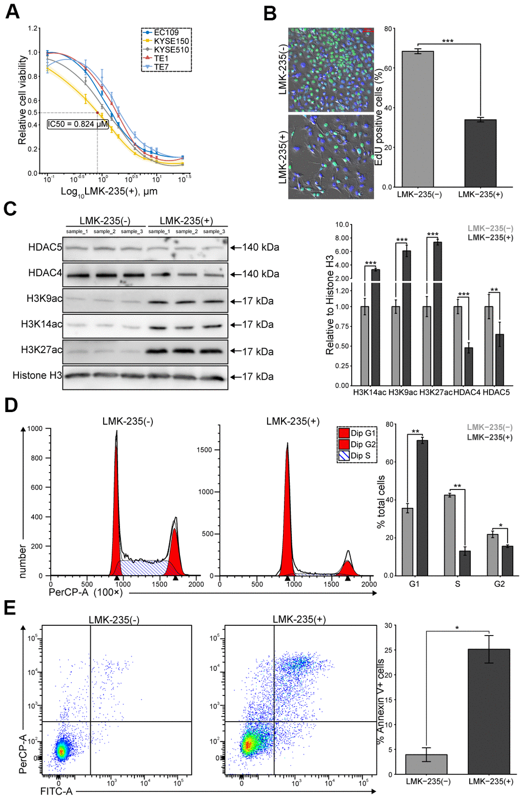 We evaluated the cytotoxicity of LMK-235 on ESCC cells, including EC109, TE-1, TE-7, KYSE150, and KYSE510. We observed dose-dependent impaired viability at 48 hr, where KYSE150 was detected as the most sensitive cells (IC50 = 0.824 μM, Figure 1A). We found that the percentage of EdU incorporation in KYSE150 was significantly reduced by LMK-235 (Figure 1B). Meanwhile, the levels of acetylated lysine residues of histone H3 (H3K27ac, H3K14ac, and H3K9ac) and class IIa HDACs (HDAC4 and HDAC5) were increased and decreased in response to the LMK-235 treatment of KYSE150, respectively (Figure 1C). Moreover, we found that G1/S transition was significantly blocked (Figure 1D), and the rates of apoptosis were increased (Figure 1E), in KYSE150 treated with LMK-235. Our data demonstrate the potential therapeutic value of LMK-235 to ESCC cells.