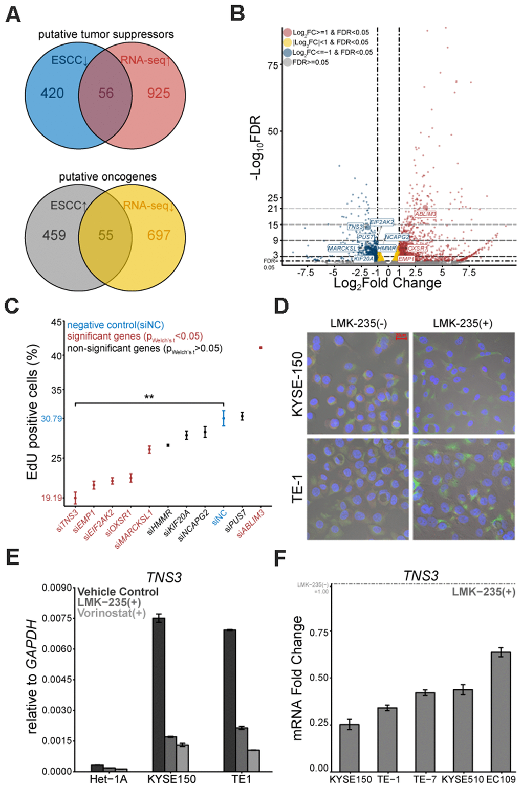 Based on the intersections of genes (shown in Figure 2A) and their possible link with ESCC carcinogenesis, we selected 10 genes (Figure 2B). To determine the proliferation linked candidates, the customized siRNA library based on a high-content screen was conducted on KYSE150. EdU positive rate demonstrated that silencing TNS3 led to the most distinct proliferation impairment (Figure 2C). We also examined these six proliferation related genes in KYSE150 and TE-1 treated with LMK-235 by qRT-PCR (Supplementary Figure 1F). Furthermore, we found that TNS3 localized in the cytoplasm of KYSE150 and TE-1, while their expressions were down-regulated by LMK-235 (Figure 2D). We detected TNS3 expression showing comparable vulnerability to Vorinostat (SAHA) with LMK-235 (Figure 2E), and it also exhibited LMK-235-specific regulated genes across the other ESCC cells (Figure 2F).