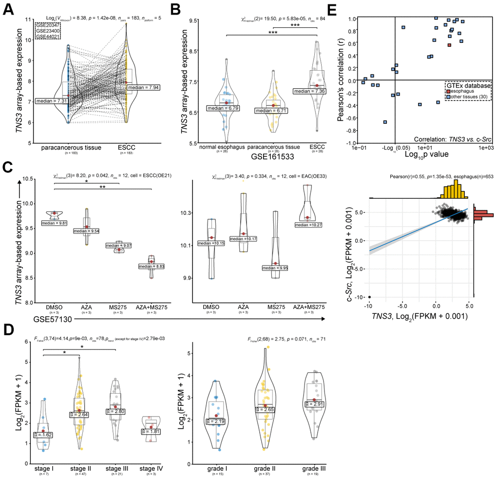 The oncogenic role of TNS3 in cancers could be mainly attributed to Src family kinases (SFKs, mainly Src), which mediate phosphorylation of SH2 domains of TNS3 [20, 21]. However, the role of TNS3 in ESCC has not been reported yet. We examined TNS3 expression in ESCC using GEO and TCGA databases. We found that TNS3 expression was significantly increased in ESCC compared to the related paracancerous tissues (Figure 3A), however, we did not find any significant difference between the normal esophagus and paracancerous tissues (Figure 3B). Nevertheless, TNS3 expression in ESCC cell (OE21) was demonstrated as more sensitive to HDACi (MS275) than EAC cell (OE33), especially combined with Azacitidine (AZA) (Figure 3C). In addition, we detected that the higher expression of TNS3 positively correlated with the clinical TNM stage (p trend = 2.79e-03, except for stage IV), and showed borderline significance with advanced histopathological grade (p = 0.071) (Figure 3D). We also found that positive correlations between TNS3 and c-Src in most normal tissues based on GTEx database (Figure 3E).