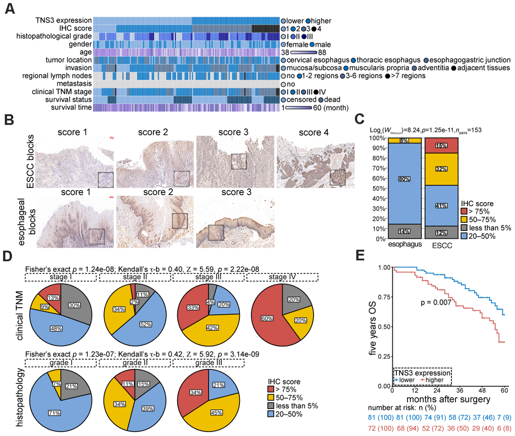We examined TNS3 expression using IHC in 153 pairs of ESCC blocks. Patients’ features were shown in Figure 4A. We observed a significant increase of TNS3 expression in tumor blocks as compared to the normal blocks (Figure 4B, 4C). The staining scores presented positive correlations with clinical TNM stage (Kendall’s τ-b = 0.40, p = 2.22e-08) and histopathological grade (Kendall’s τ-b = 0.42, p = 1.23e-07), suggesting that TNS3 may facilitate the tumorigenesis of ESCC (Figure 4D). Moreover, the five years OS rate of these patients with higher levels of TNS3 showed a dismal prognosis (Figure 4E). Collectively, these findings indicate a contribution of over-expressed TNS3 to the malignant phenotypes of ESCC.