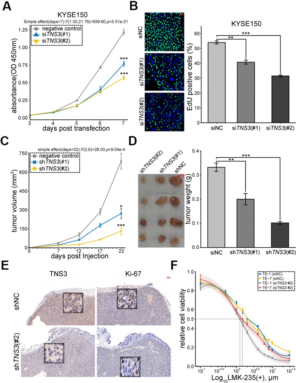In order to examine the biological functions of TNS3 in ESCC, we inhibited its expression through siRNAs (Supplementary Figure 2A, 2B). The results showed impaired cell proliferation in KYSE150 and TE-1 transfected with siTNS3 (#2) (Figure 5A, 5B and Supplementary Figure 2C, 2D). We further investigated the role of TNS3 in vivo using subcutaneously xenograft tumor mice model and found that KYSE150 expressing shTNS3 (#2) significantly reduced the tumor volume and weight compared to shNC (Figure 5C, 5D). We also detected decreased expressions of TNS3 and Ki-67 in subcutaneous tumor blocks (shTNS3 #2) (Figure 5E). The positive correlations of TNS3 and MKI67 were found in most cancers, including ESCC (Supplementary Figure 2E). Furthermore, TNS3 knockdown could sensitize TE-1 and TE-7, which detected as higher IC50 value than KYSE150 (shown in Figure 1A), to the treatment of LMK-235 (Figure 5F).