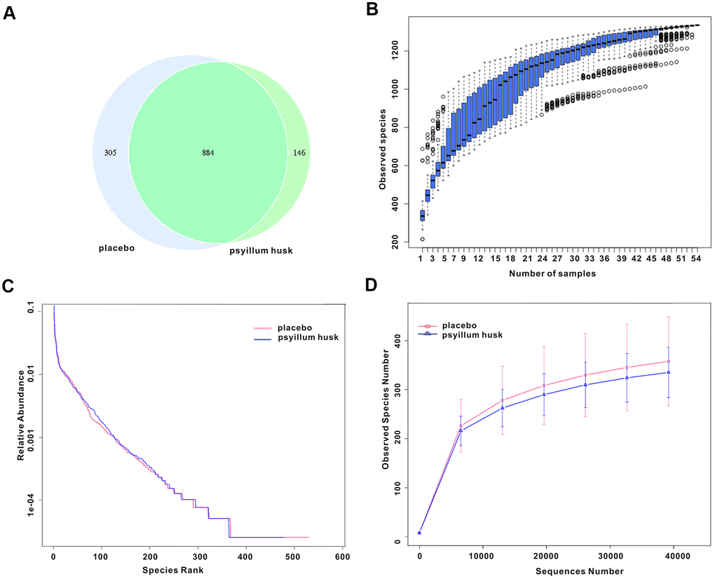 Numerous studies have shown that disorders of intestinal flora are among others associated with chronic constipation [11]. To further explore the potential intestinal flora–related mechanisms of psyllium husk in relieving the clinical symptoms of chronic constipation in women of reproductive age, we determined microbiotal compositions via 16S rRNA sequencing. After filtering, quality control, and chimera removal, a total of 4,658,291 effective sequences were obtained from the 54 fecal samples (29 samples from the placebo group, 25 samples from the psyllium husk group). In addition, 1,335 operational taxonomic units (OTUs), which can be used to further analyze species within sample via rapid visualization of species composition and abundance, were matched at 97% identity, including 21 phyla, 37 classes, 74 orders, 126 families, 261 genera, and 230 species of gut microbes that we annotated for subsequent analyses. Venn diagrams showed that the two groups shared 844 common OTUs (Figure 1A). We used a species-accumulation boxplot to evaluate the sufficiency of sample number and species richness. As shown in Figure 1B, when the number of samples reached 54, the number of species observed was nearly parallel, indicating that the sample size of our experiment was sufficient. Rank abundance was used to reflect the richness and uniformity of species in each sample, while the rarefaction curve was used to reflect the rationality of the amount of sequencing data and to indirectly reflect species abundance in each sample. The rank abundance curve of the psyllium husk group was slightly lower than that of the placebo group, but this difference was not statistically significant (Figure 1C). Furthermore, the rarefaction curve had similar trends in both groups (Figure 1D).