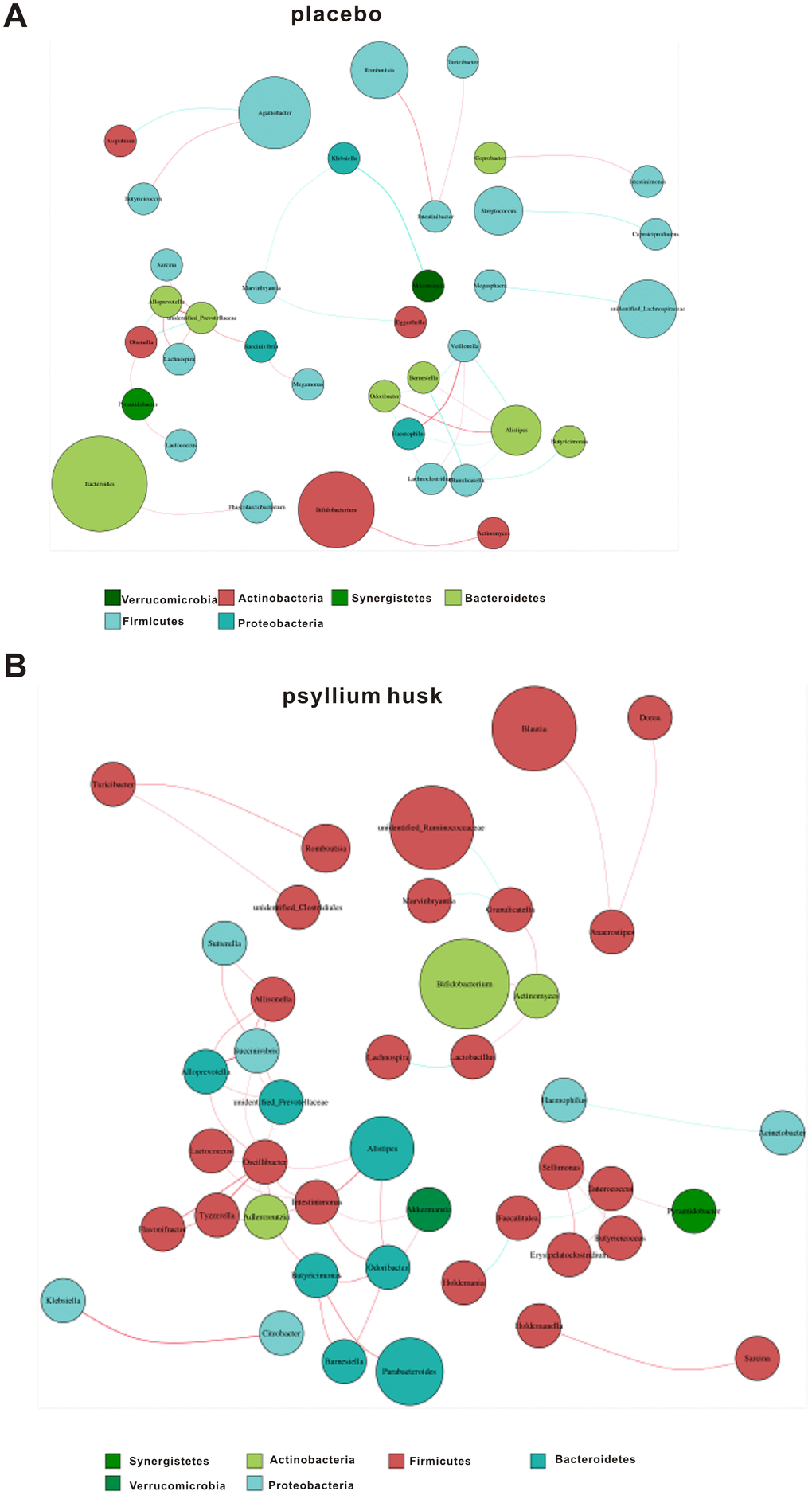To determine whether intestinal flora structure was also changed in the psyllium husk group, we conducted correlation network analysis and found further significant correlations and more clustering of OTUs compared with samples from the placebo group. These results indicated that altered correlation network structure following psyllium husk intervention might be involved in the different compositions and metabolic functions of the gut microbiota.