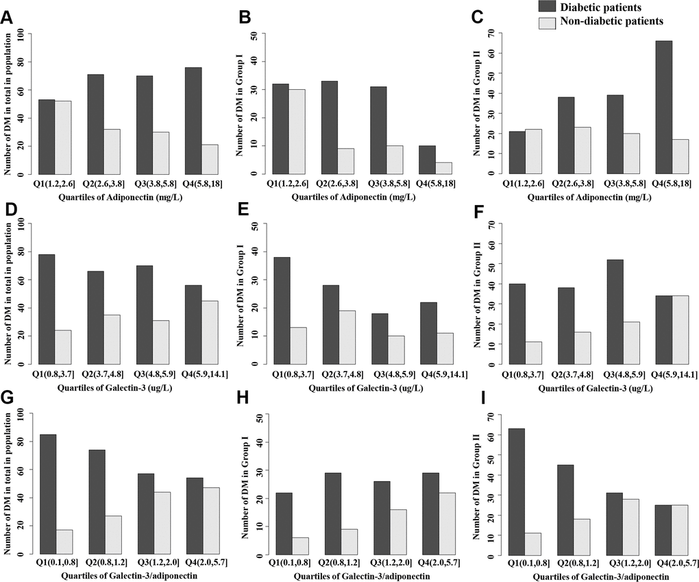 Demographic and biochemical findings of subjects with and without incident type 2 diabetes in the total population, Group I (age<50 years old) and Group II (age≥50 years old) were expressed in Table 2. In the total population, compared to the nondiabetic group, body weight, body mass index (BMI), waist circumference (WC), waist-hip ratio (WHR), body fat, diastolic blood pressure (DBP), total cholesterol (TC), triglycerides (TG), galectin-3 and galectin-3/adiponectin (Gal-3/ADPN) of the diabetic group were higher (P<0.05), and high-density lipoprotein cholesterol (HDL-C) and adiponectin were lower (P<0.05). We found that the differences in these factors were mainly concentrated in the older group rather than the younger group. Higher galectin-3 and galectin-3/adiponectin quartiles were more significantly associated with a greater number of diabetic patients and fewer nondiabetic patients in group I than in group II (Figure 1).